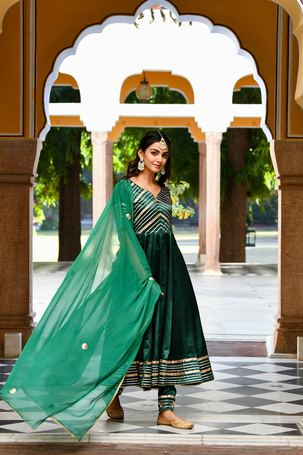 Bottle Green Satin Anarkali Suit- (3Pc Set) By SUTI KAPDA